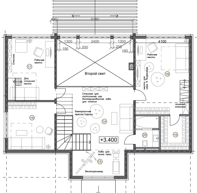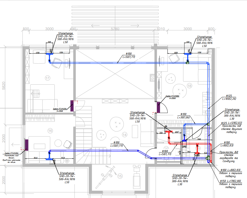 Система кондиціювання базується на використанні настінних, підлогових та канальних фанкойлів Daikin, що працюють у парі з тепловим насосом. Через високий теплоприток для охолодження найбільшої зони — вітальні з другим світлом — додатково застосована окрема спліт-система. Повітророзподіл здійснюється через лінійні щілинні дифузори українського виробництва та німецькі решітки Trox у зонах, де монтаж дифузорів неможливий.